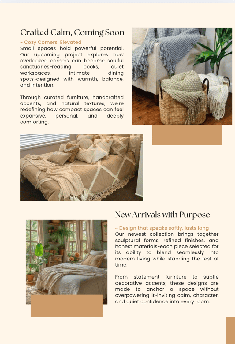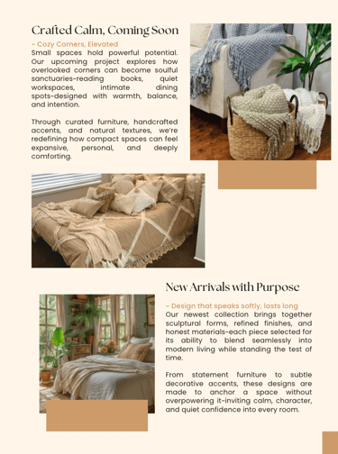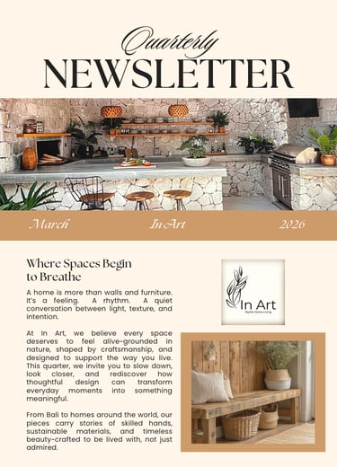Our newsletter features insightful stories and updates on our project and product development, among other topics. For your reference, please explore further details regarding our products, services, and the cultural aspects that enrich the narratives behind each product. Enhance your living space with our offerings. Subscribe to our quarterly newsletter for convenient and pleasant reading that keeps you informed about the latest styles and encourages you to explore new trends.
